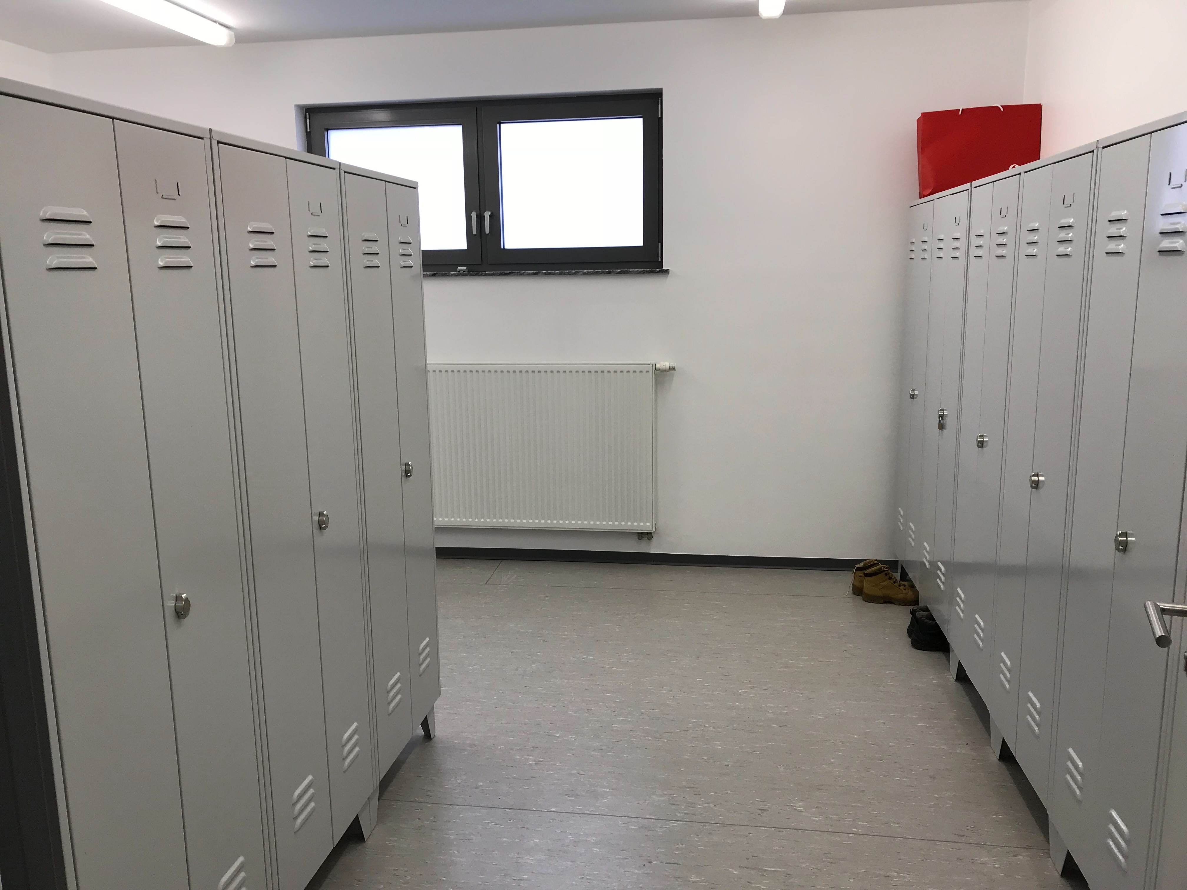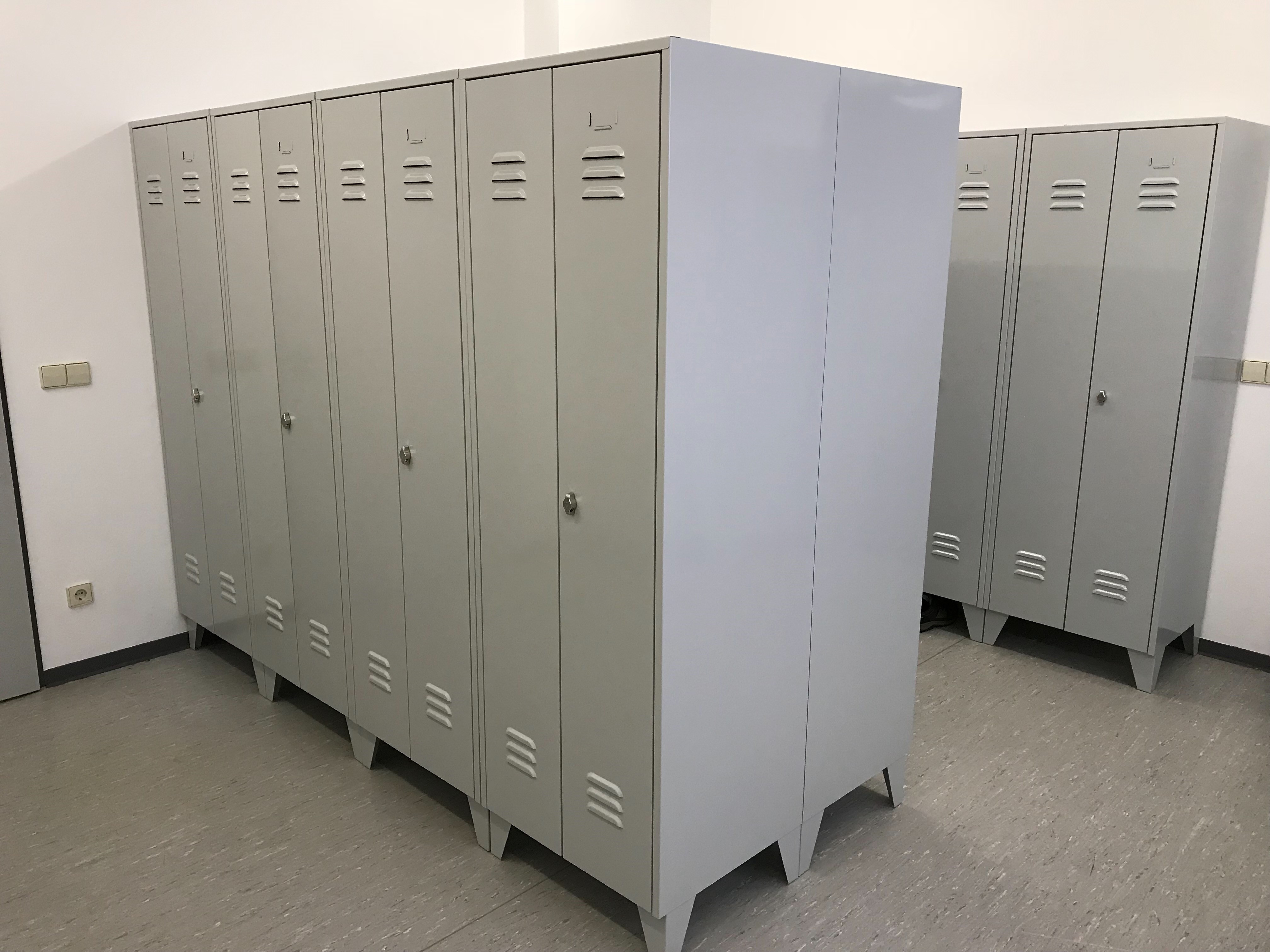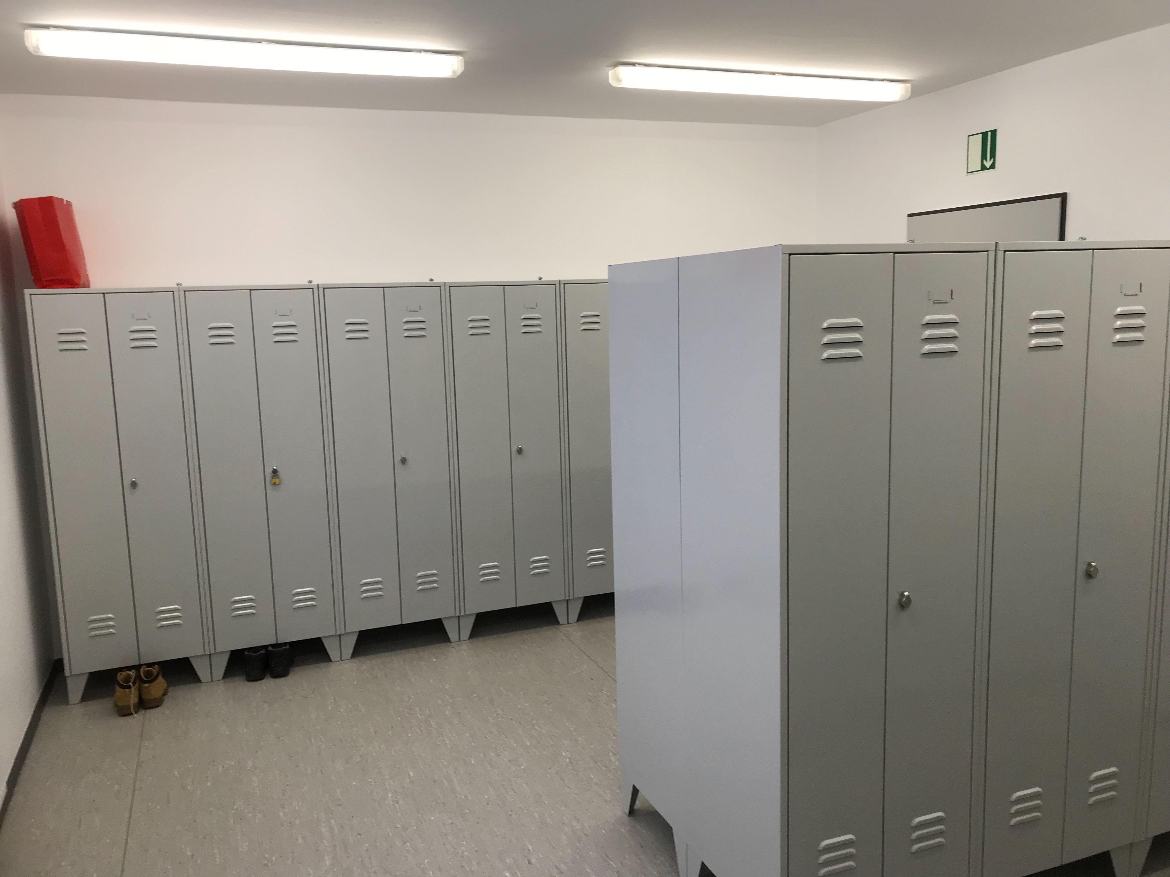 Man entschied sich hier für die Schränke nach ASR (Arbeitsstättenrichtlinie). Jeder Mitarbeiter hat somit ein Abteil für die reine Kleidung und ein Abteil für die unreine Kleidung. Die Türen sind zueinanderschlagend und somit nur mit einem Schloss abschließbar.